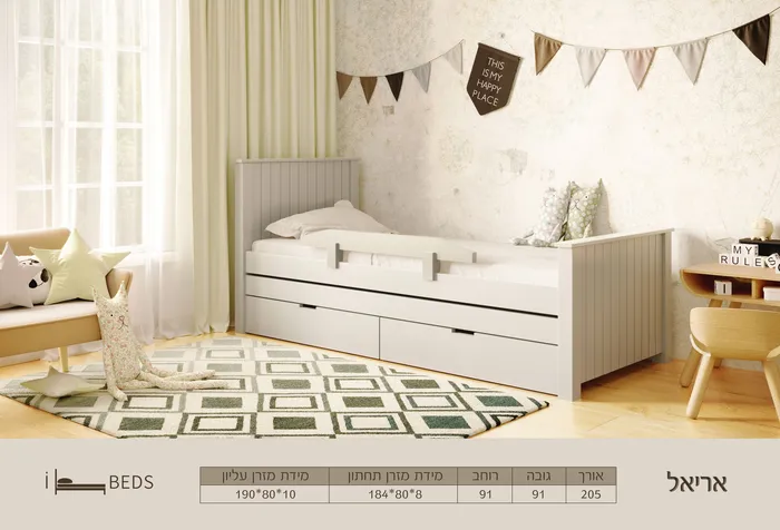 מיטה מעוצבת לילדים, עשויה עץ אורן פיני מלא בשילוב MDF. למיטה קיים פרזול פנימי ממתכת, אשר מעניק למיטה: אסתטיות, חוזק ויציבות עמידה במיוחד. המיטה צבועה בצבע אפוקסי אטום תוצרת איטליה, בעל תקנים מחמירים. מיטה עליונה בעלת מזרן בגודל 190/80/10 (ניתן לקבל גם ברוחב 90) אשר מונח על לייסטים מעץ ברוחב 9.5 ס"מ ובעובי של 2 ס"מ המחולקים בצורה שווה לאורך המיטה אשר נותנים למזרן תמיכה מקסימאלית ואוורור. מיטת חבר נשלפת בעלת מזרון בגודל 184/80/8 אשר מונח על לייסטים מעץ ברוחב 9.5 ס"מ ובעובי של 2 ס"מ המחולקים בצורה שווה לאורך המיטה אשר נותנים למזרן תמיכה מקסימאלית ואוורור. בנוסף לכך, המיטה הנשלפת מגיעה עם 5 גלגלי פלסטיק יצוק ליציבות מקסימאלית ושליפה קלה ונוחה של המיטה. 2 מגירות לאחסון העשויות מסנדוויץ' מצופה פורמייקה לבנה הנמצאות במיטה הנשלפת. כל מגירה הינה בעומק של 55 ס"מ. למסילות המגירות מעצורים מיוחדים לפתיחה בטוחה, כך שהילדים לא יוכלו למשוך את המגירות החוצה. המיטה מגיעה עם זוג מזרני ספוג כחול איכותיים בעובי 10 ס"מ למיטה העליונה ו-8 ס"מ למיטה הנשלפת. המיטה מגיעה עם מגן בטיחות נשלף , להגנה מקסימלית במצב שינה על הילדים.