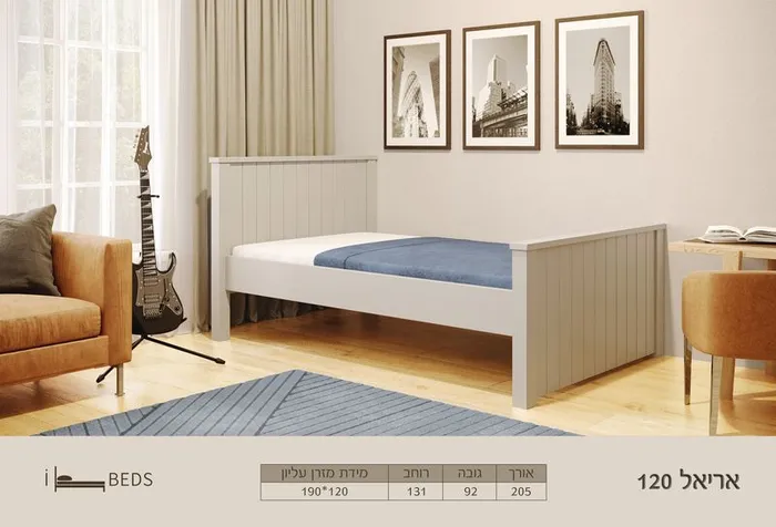 מיטה מעוצבת לנוער, עשויה עץ אורן פיני מלא בשילוב MDF. למיטה קיים פרזול פנימי ממתכת, אשר מעניק למיטה: אסתטיות, חוזק ויציבות עמידה במיוחד המיטה צבועה בצבע אפוקסי אטום תוצרת איטליה, בעל תקנים מחמירים. מיטה מותאמת למזרן בגודל 190/120 אשר מונח על לייסטים מעץ ברוחב 9.5 ס"מ ובעובי של 2 ס"מ המחולקים בצורה שווה לאורך המיטה אשר נותנים למזרן תמיכה מקסימאלית ואוורור. ניתן להוסיף למיטה :2 מגירות עצמאיות לאחסון מיטת חבר נשלפת עם 2 מגירות ארגז מצעים מסנדוויץ' עם משטח עץ מתרומם